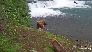 Sad news, recently, as we watched horrified as another cub (...one of 26's cubs...) was caught up in the swift current of the river. This makes two lost to the river. This one was particularly gruesome as the river washed it against a large boar who killed it instantly on the live cam.
